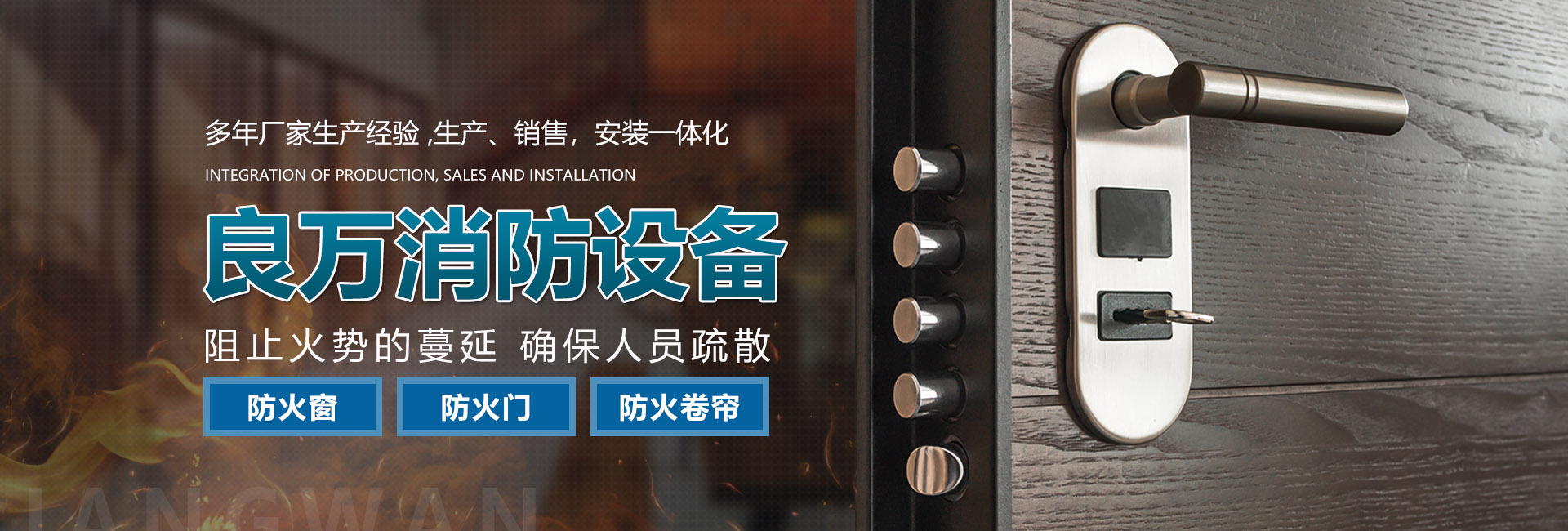 合肥良萬消防設備有限公司位于合肥市包河工業園,生產銷售安裝:防火門、防火卷簾門、防火窗等消防安全產品。公司具有研發、設計、生產、銷售、及安裝服務的綜合配套能力。合肥良萬消防設備有限公司技術力量強,設備齊全,產品不斷創新,以信譽立業,客戶滿意是我們永無止境的追求。我們在保證產品質量的同時,也十分注重售后服務,保證消防安全產品的正常運行。公司始終堅持誠信為本的企業宗旨,真誠希望與社會各界新老客戶精誠合作,良萬愿與您攜手共創輝煌!